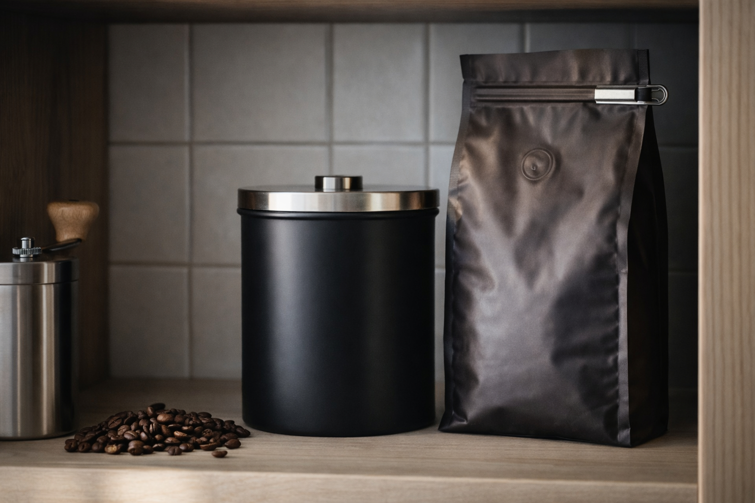 Pokud otevíráte balení často (např. v kanceláři), vyplatí se přesypat část kávy do vzduchotěsné nádoby. Ideální jsou nádoby, které minimalizují kontakt se vzduchem (např. s pístem nebo ventilem). Důležité je, aby nádoba nebyla průhledná nebo aby stála v temnu.